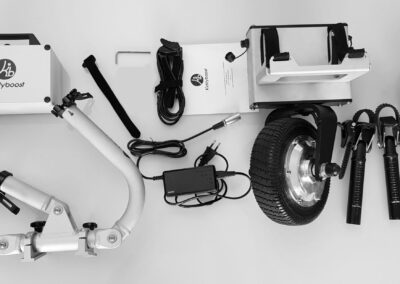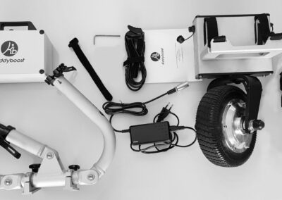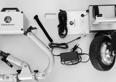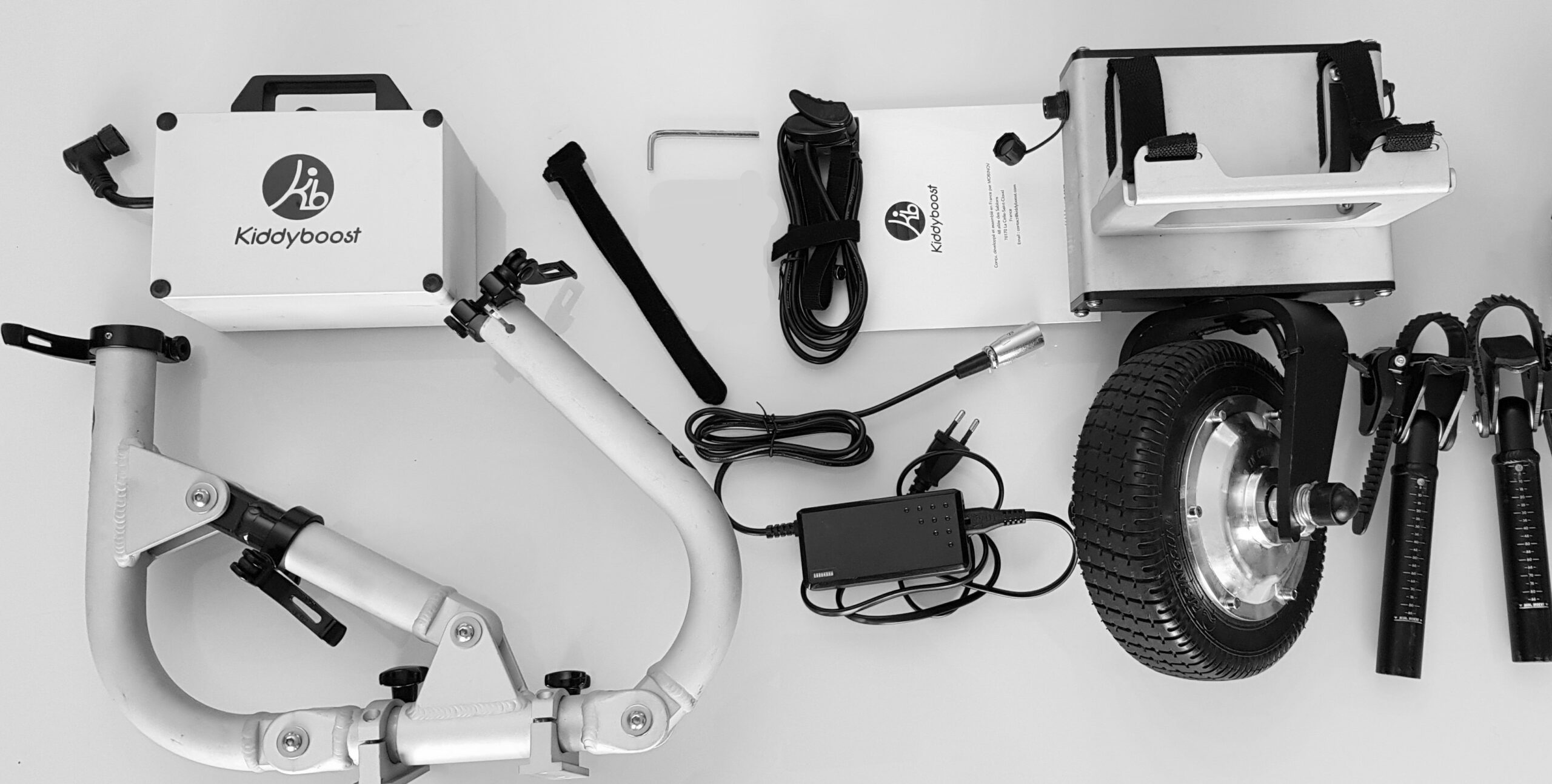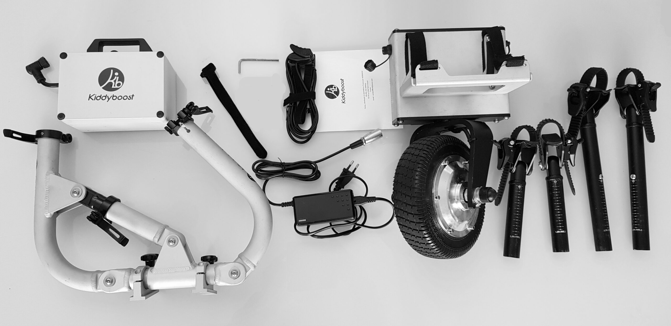 Kiddyboost est un système d’assistance électrique amovible destiné à être associé à la plupart des poussettes d’enfant pour soulager l’effort. – Facile à installer, il se monte ou se démonte en moins d’une minute. – Disponible en 2 longueurs de rallonges en fonction de la taille de la poussette à motoriser (STD ou XL, possible de prendre les deux longueurs STD+XL pour motoriser des poussettes de différentes tailles). – Une fois le système allumé, il suffit d’appuyer sur la gâchette et pousser en même temps, l’assistance électrique s’enclenche au bout de 1 à 4 pas. – Vitesse réglable jusqu’à 4 km/h. – Jusqu’à 4 enfants possibles dans une côte à 10%. – Motorisation 24V de 200W. – Une batterie lithium-ion amovible de 24V disponible en 4Ah ou 7.8Ah pour une autonomie respectivement jusqu’à 15 kilomètres ou 30 kilomètres sur le plat (à vitesse constante de 4 kmh avec 4 enfants ou 100 kg poussette comprise). – La batterie se recharge en moins de 2 ou 4 heures avec le chargeur secteur fourni. – Kiddyboost ne pèse qu’environ 9,5 kilos (fonction des options). – La batterie et les bras sont démontables pour faciliter son transport ou son rangement. – Kiddyboost est uniquement une aide à la poussée; il ne freine pas la poussette dans les descentes. – Garantie : 2 ans (sauf batterie 1 an) AVANT DE COMMANDER : 1 – Vérifiez la compatibilité de votre poussette : Bien vérifier la compatibilité de sa poussette avec Kiddyboost (consulter la rubrique FAQ de la page fonctionnement). En cas de doute, consultez le tableau « poussettes compatibles » en cliquant ICI ou nous envoyer un email à contact@kiddyboost.com. 2 – Identifiez la bonne taille des rallonges : STD ou XL ? Cela dépend à la fois de la largeur de la poussette, de l’encombrement du frein de parking et de l’emplacement des montants arrière pour venir s’accrocher. Consultez le FAQ de la page fonctionnement ou le tableau « liste des poussettes compatibles» en cliquant ICI, ou nous envoyer un email à contact@kiddyboost.com. 3 – Sélectionner la bonne capacité de batterie : L’autonomie varie fortement en fonction des enfants (nombre et poids ), le dénivelé, la durée d’utilisation journalière, les conditions météo (vent,froid, etc…)… Pour vous aider, cliquez ICI pour choisir la plus appropriée.